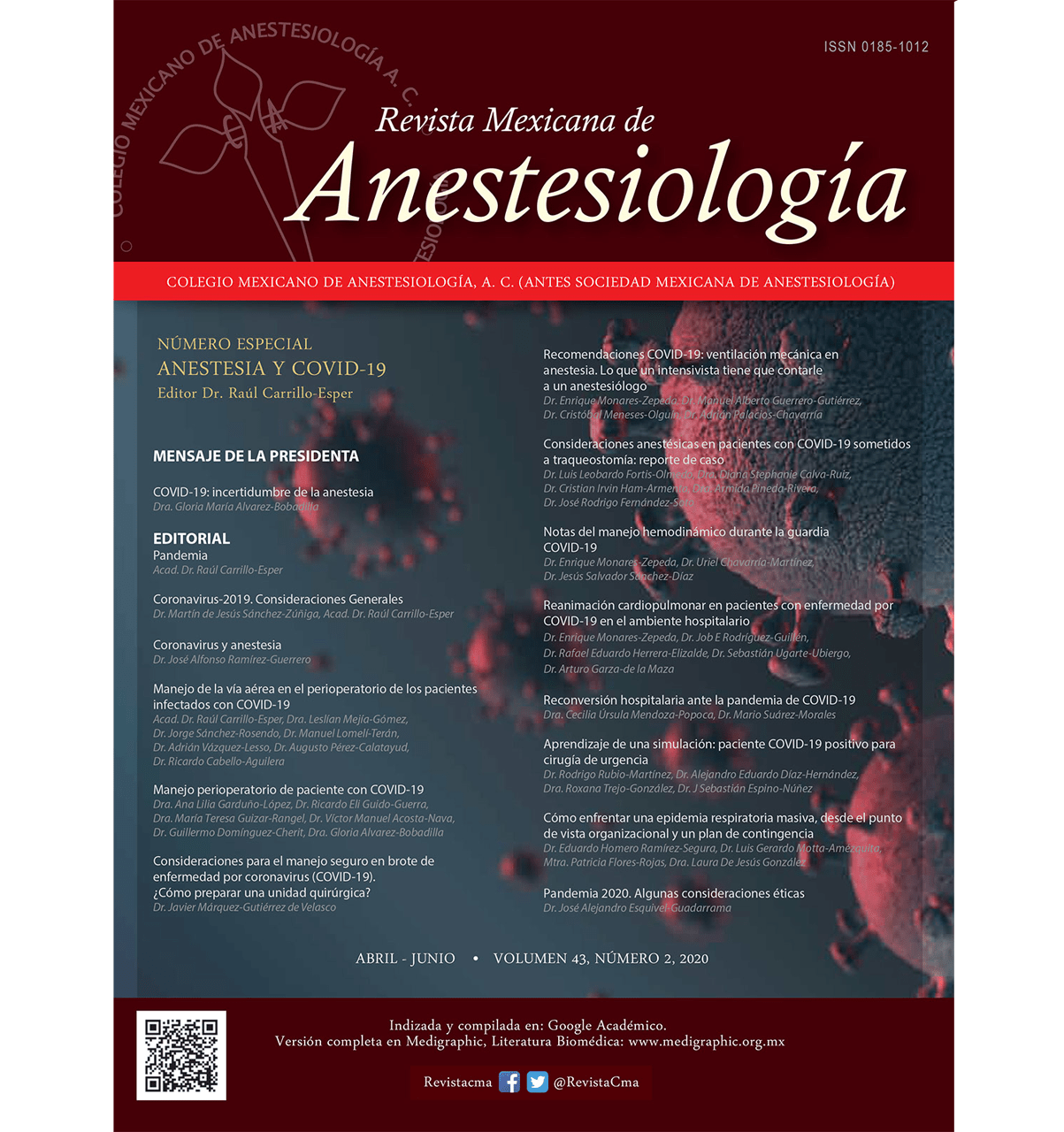 La Revista Mexicana de Anestesiología (ISSN-0185-1012) es la Publicación Oficial del Colegio Mexicano de Anestesiología, A.C. (antes Sociedad Mexicana de Anestesiología), y se publica cuatro veces al año (trimestralmente). Los manuscritos para publicación, correspondencia relativa al material editorial y cartas al Editor deberán enviarse a sus oficinas administrativas con domicilio en Nueva York 32, Departamento 803, Colonia Nápoles, Alcaldía Benito Juárez, CP 03810, Ciudad de México, Teléfono: 5 669-1457, Fax: 5 669 1659. Todos los artículos son aceptados para su publicación, siempre y cuando sean contribuciones exclusivas para la Revista, se trate de material inédito y no esté contemplada su publicación en otra revista nacional o internacional. Todos los artículos recibidos son propiedad exclusiva del Colegio Mexicano de Anestesiología, A.C. (© 2001, Colegio Mexicano de Anestesiología, A.C.). Las afirmaciones y opiniones expresadas en la Revista reflejan el enfoque del(los) autor(es) y no representan el punto de vista del Colegio Mexicano de Anestesiología, a menos que se afirme lo contrario. Para detalles y recomendaciones concernientes a la preparación de los manuscritos deberán seguirse las normas editoriales, que aparecen en cada número de la Revista. La correspondencia relacionada con la industria farmacéutica deberá enviarse a las oficinas administrativas del Colegio. La publicación de anuncios o comerciales de la Industria Farmacéutica en la Revista Mexicana de Anestesiología, no significa compromiso del Colegio para con los productos o servicios descritos en el anuncio o cualquier representación hecha por el anunciante con respecto a su producto o servicio. Queda prohibida su reproducción total o parcial por cualquier medio conocido o por conocer, sin la autorización por escrito del titular de los Derechos de Autor. Diseño, formación e impresión por Graphimedic S.A. de C.V., emyc@medigraphic.com para el Colegio Mexicano de Anestesiología. Tiraje: 3,000 ejemplares. Suscripción anual: Individual $650.00, Instituciones $700.00 en la República Mexicana. Números anteriores $90.00. Suscripción anual en el extranjero $90.00 dólares americanos; números anteriores 20.00 USD. El Colegio Mexicano de Anestesiología, A.C., reemplazará cualquier número siempre y cuando se reciba la reclamación dentro de los primeros 5 meses de su publicación. Certificado de Reserva otorgado por el Instituto Nacional del Derecho de Autor: 04-2004-043011242800-102. Certificados otorgados por la Comisión Calificadora de Publicaciones y Revistas Ilustradas. Licitud de Título No. 13087 y Contenido No. 10660. Publicación periódica. Registro No. PP09-1325. Autorizada por el Servicio Postal Mexicano..